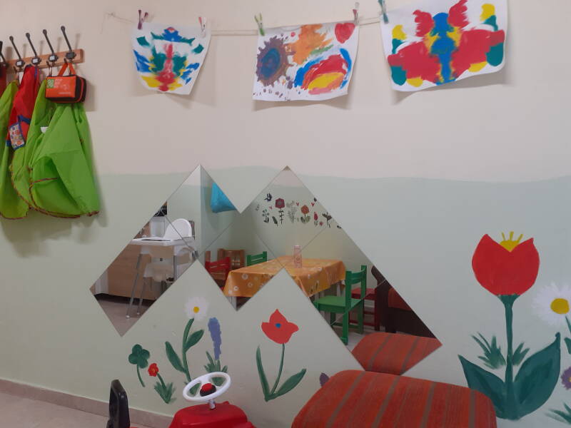 Der Schlafraum ist ausgestattet mit Matratzen, Decken und Kissen. Jedes Kind hat seinen eigenen festen Schlafplatz.